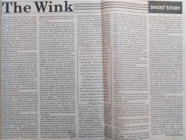 Kaliappan looked back at the post and the partially burnt woods for sometime, and then looked up at the sky. Rain lashed all over his face, and thunder struck again and again. He kept looking at the sky, when a lightning flashed, he smiled. That particular lightening reminded him of his own way of winking.