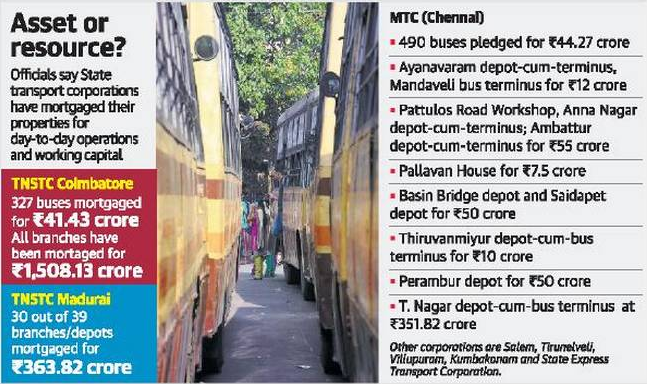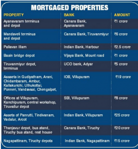 The state express transport corporation headquarters in Chennai, its depot and its admin block, besides Coimbatore depot and bus stand have been mortgaged with Tamil Nadu Transport Development Finance Corporation for Rs 192 crore. The bus depot and terminus at T. Nagar had been mortgaged with the same corporation for over Rs 87 crore.